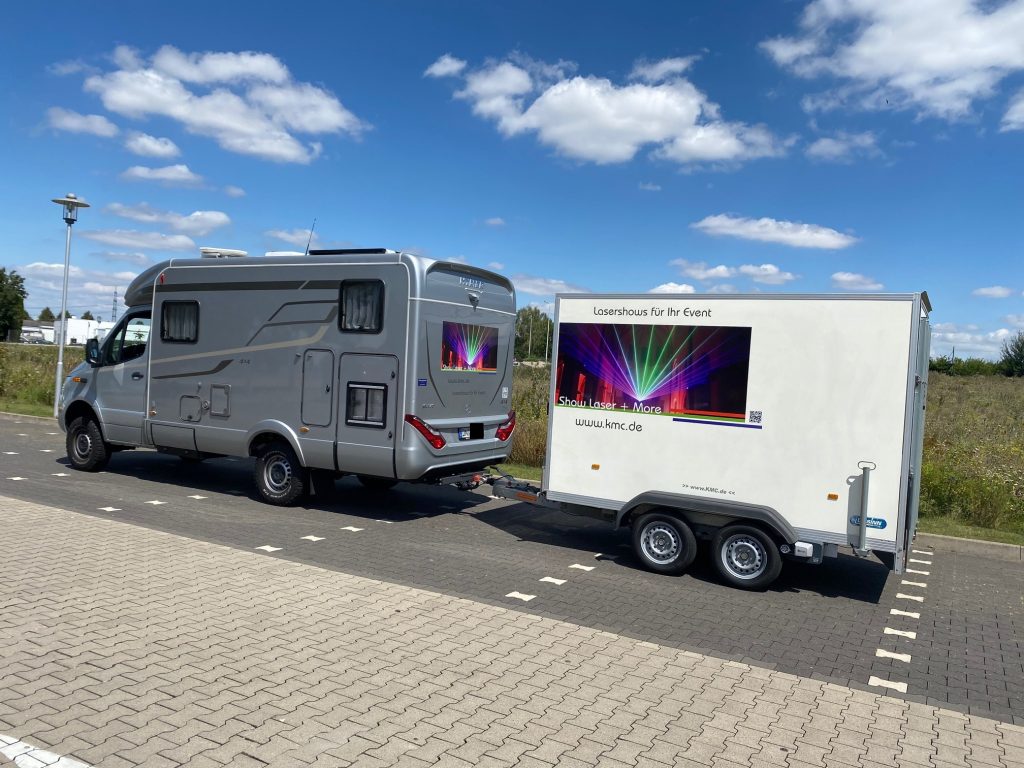 Wir reisen mit unserem Lasereventliner an (Allrad Wohnmobil mit Anhänger). Bei Bedarf bauen wir am Vorabend auf und übernachten bei Ihnen. Die Lasersteuerung kann bei Outdoor Events vom Lasereventliner erfolgen.